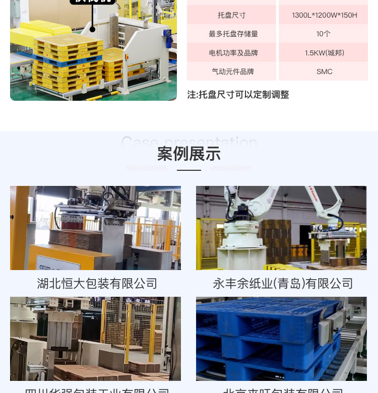 產品簡述:供棧機則是棧板分離機結構控制棧板掉落在鏈板輸送線上,分離機構成可根據棧板不同尺寸自動調整寬度,棧板分離后,經由鏈板線輸送至碼垛機器人處。