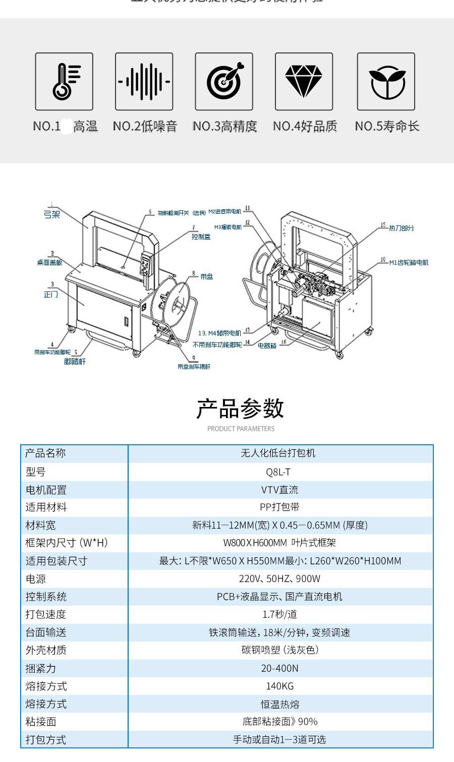 介紹:電機+減速機+凸輪+緊縮臂運作,捆緊力大,故障少,維修方便。 零部件均由電腦微控機床精密加工,機械動作柔和穩定,耐久性,功能齊全,使用壽命長。 捆包結束后電機馬上停止運轉,省電實用。 保養容易,免加油,機械堅固,操作簡單。 用途廣泛,可單機操作或配合其他機種,設計自動化與無人化的生產系統。 外型精巧、美觀、節省空間。 側式設計可避免機器接觸到水或其它污染物 打包機不脫帶,自動送帶 ?